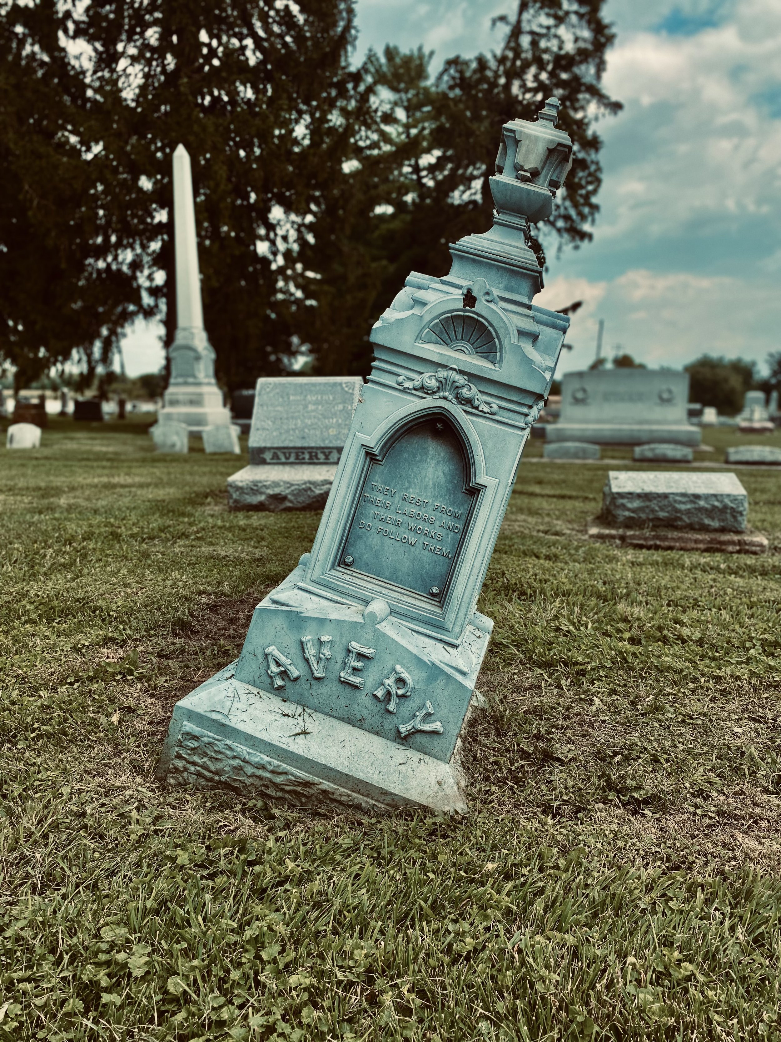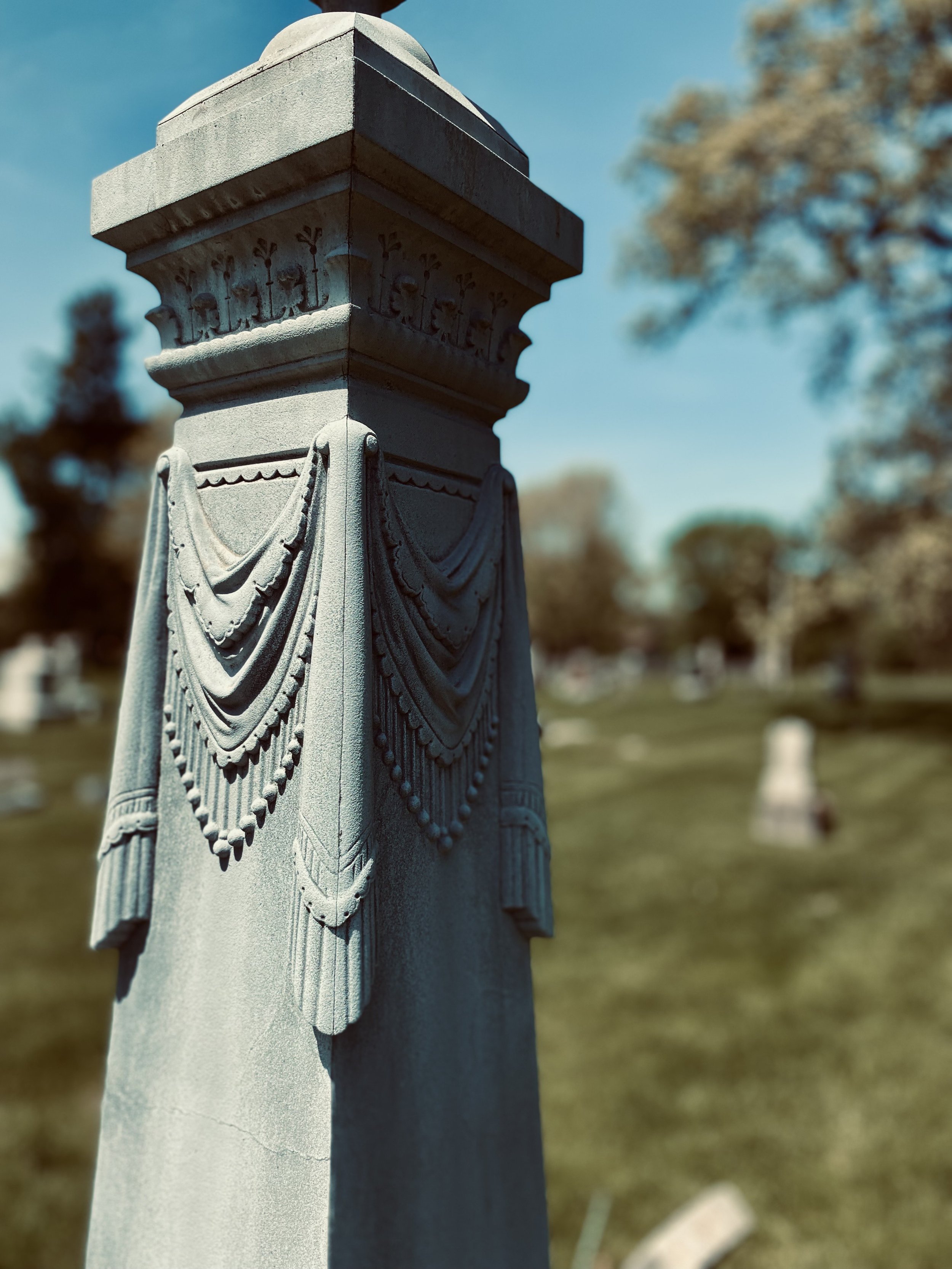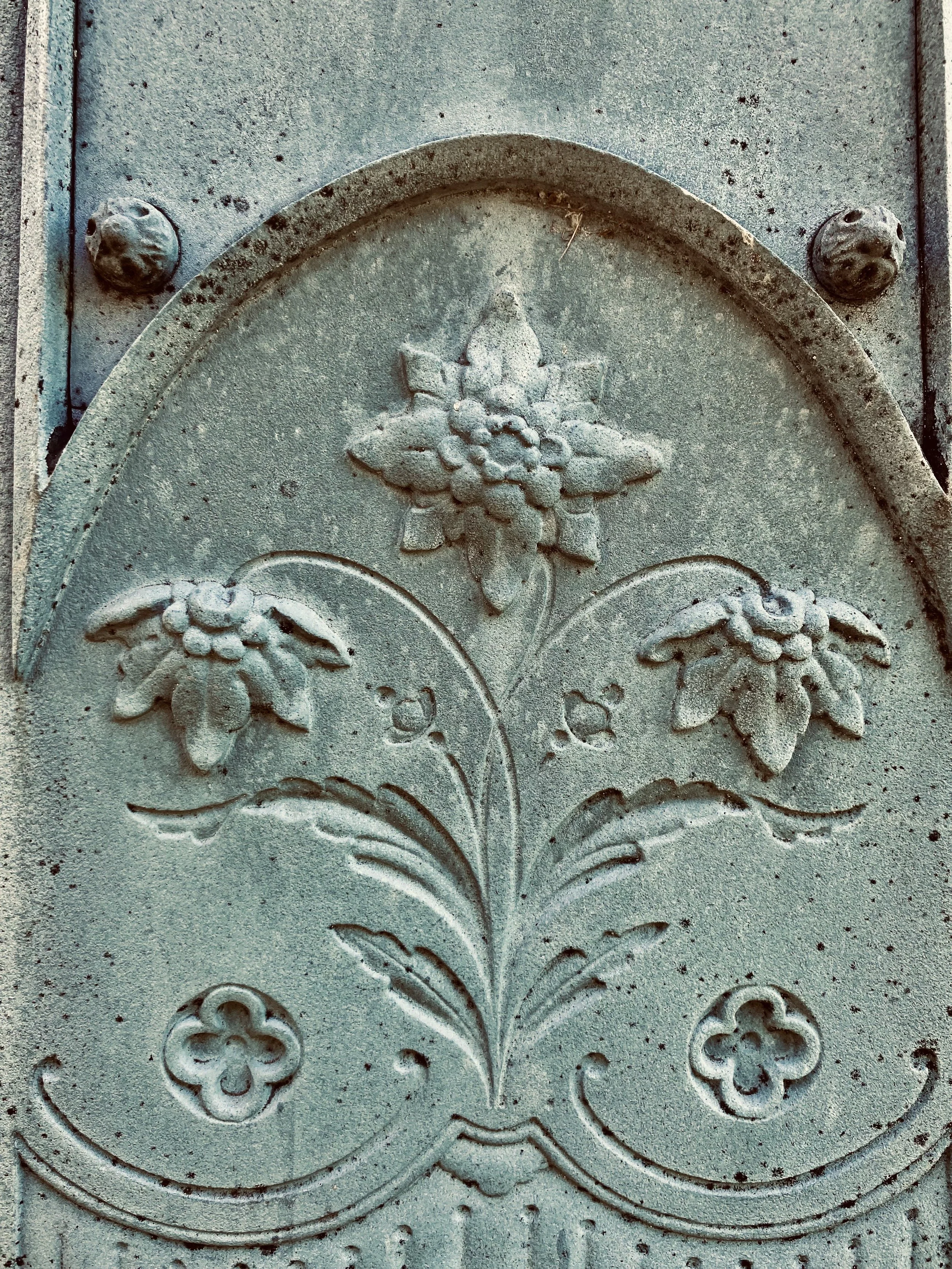White Bronze Monuments were commonly used as gravestones between 1874 – 1914. They were composed of copper, tin, and zinc, which made them a blueish-grey color. Another interesting unique feature is the fact that they are hollow inside.